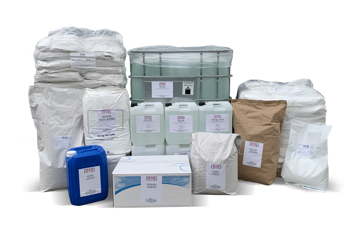 La nostra gamma di additivi e coadiuvanti offre: Acido lattico E270, Acido citrico E330, Potassio sorbato E202, Calcio lattato E327, Amido modificato E1422, Glucone-delta-lattone E575, Calcio cloruro, Magnesio cloruro.